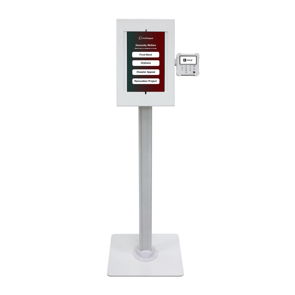 POD Pro comes with Lenovo 10 inch tablet, SumUp Solo card machine, secure casing and floor stand .